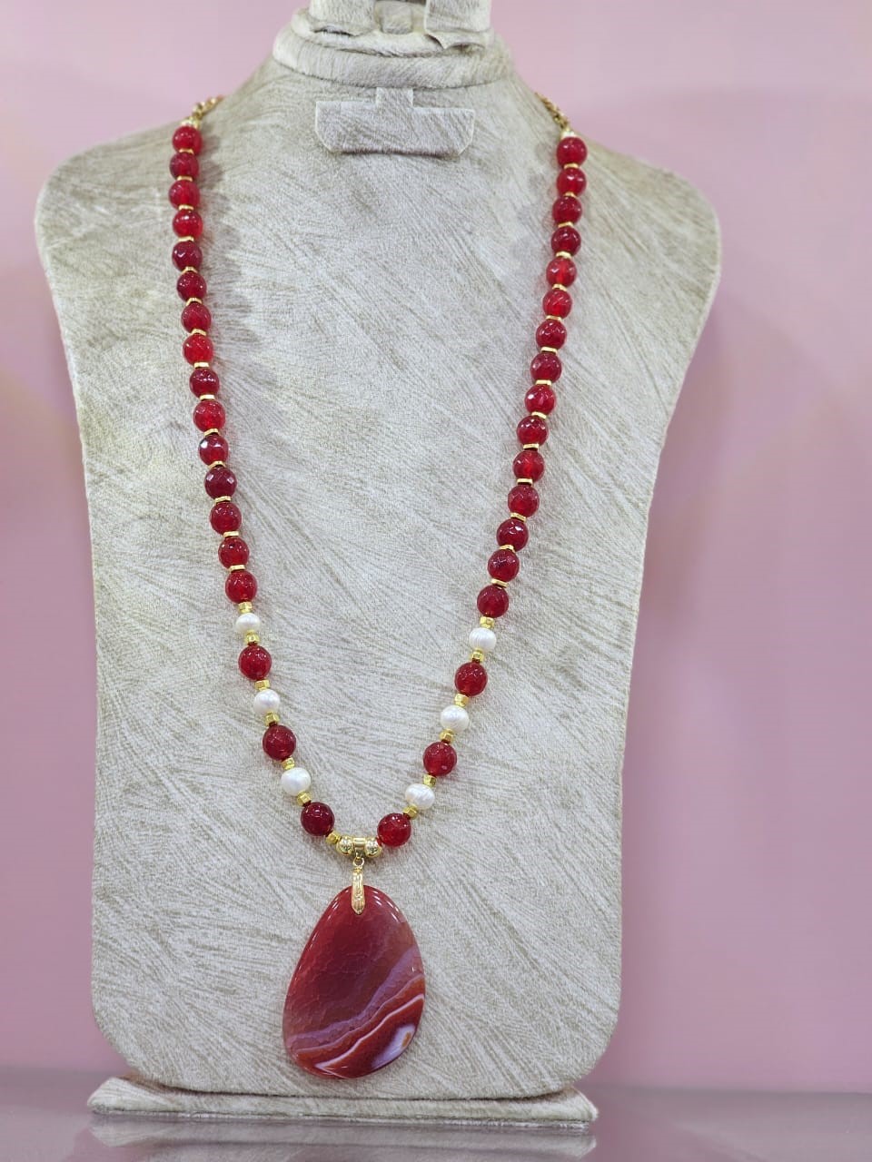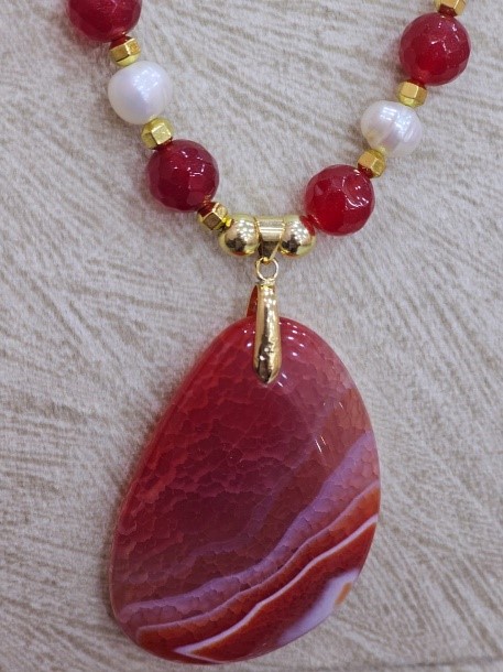 Add warmth and elegance to your accessory collection with this Natural Red Agate and Freshwater Pearl Necklace, beautifully handcrafted for modern sophistication. The vibrant, faceted red agate beads are paired with lustrous natural freshwater pearls, creating a striking contrast that celebrates color and luxury. Anchoring the design is a bold teardrop red agate pendant, capturing attention with its unique banded patterns and rich hues.